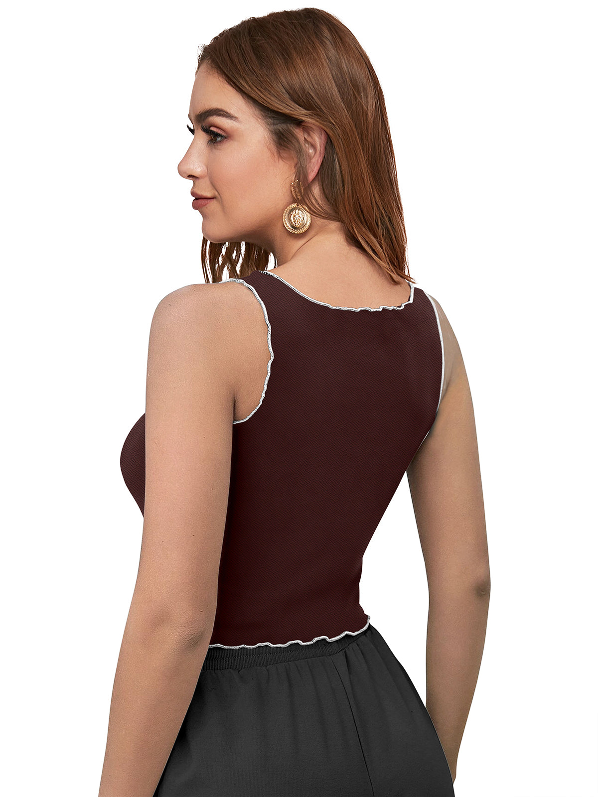 Step up your casual chic game with this trendy coffee and beige contrast crop top. Designed with bold color-block panels and edgy exposed contrast stitching, this sleeveless top brings a modern streetwear vibe to your wardrobe. The slim-fit cropped cut makes it perfect for pairing with joggers, denim, or skirts, creating versatile looks for any casual outing.