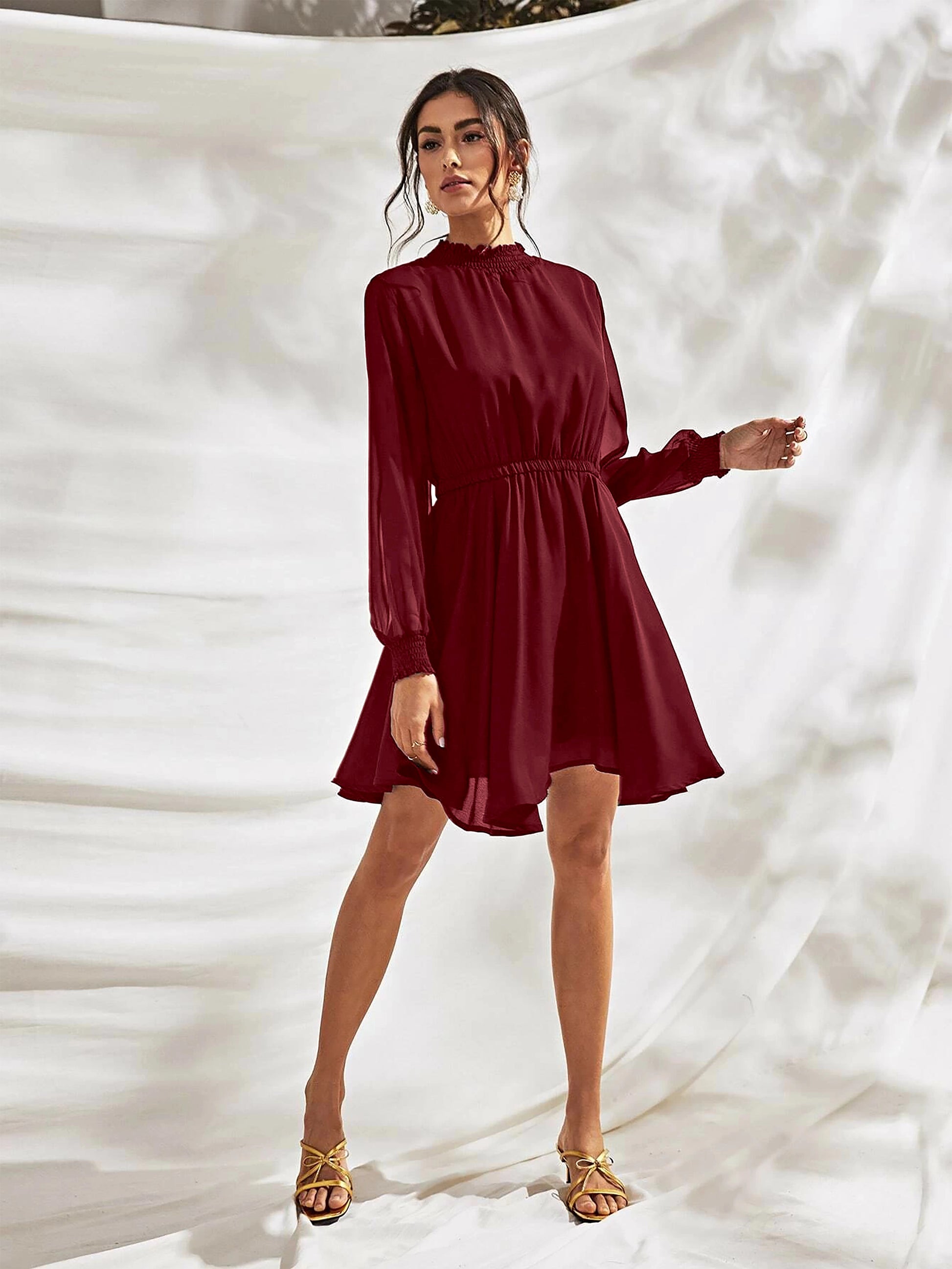 The CAIRA 09 Black High Neck A-Line Mini Dress is a timeless wardrobe essential that blends elegance with modern chic. Designed with a flattering A-line silhouette, long sheer sleeves, and a smocked high neckline, this dress offers a sophisticated yet playful vibe. Its cinched elastic waist ensures comfort and a perfect fit, while the lightweight flowy fabric adds graceful movement. Perfect for evening dinners, parties, or special occasions, this versatile black dress can be paired with heels or boots for an effortlessly stylish look.