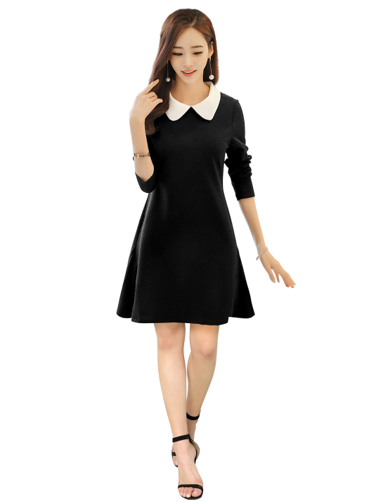 The Isha 41 Black A-Line Dress with White Peter Pan Collar is the perfect mix of sophistication and charm. Designed with a flattering A-line silhouette, this dress features a classic white Peter Pan collar that adds a touch of elegance to its timeless black base. With full sleeves and a knee-length cut, it is ideal for office wear, casual outings, or semi-formal events. Pair it with heels or flats to create a chic and polished look for any occasion.