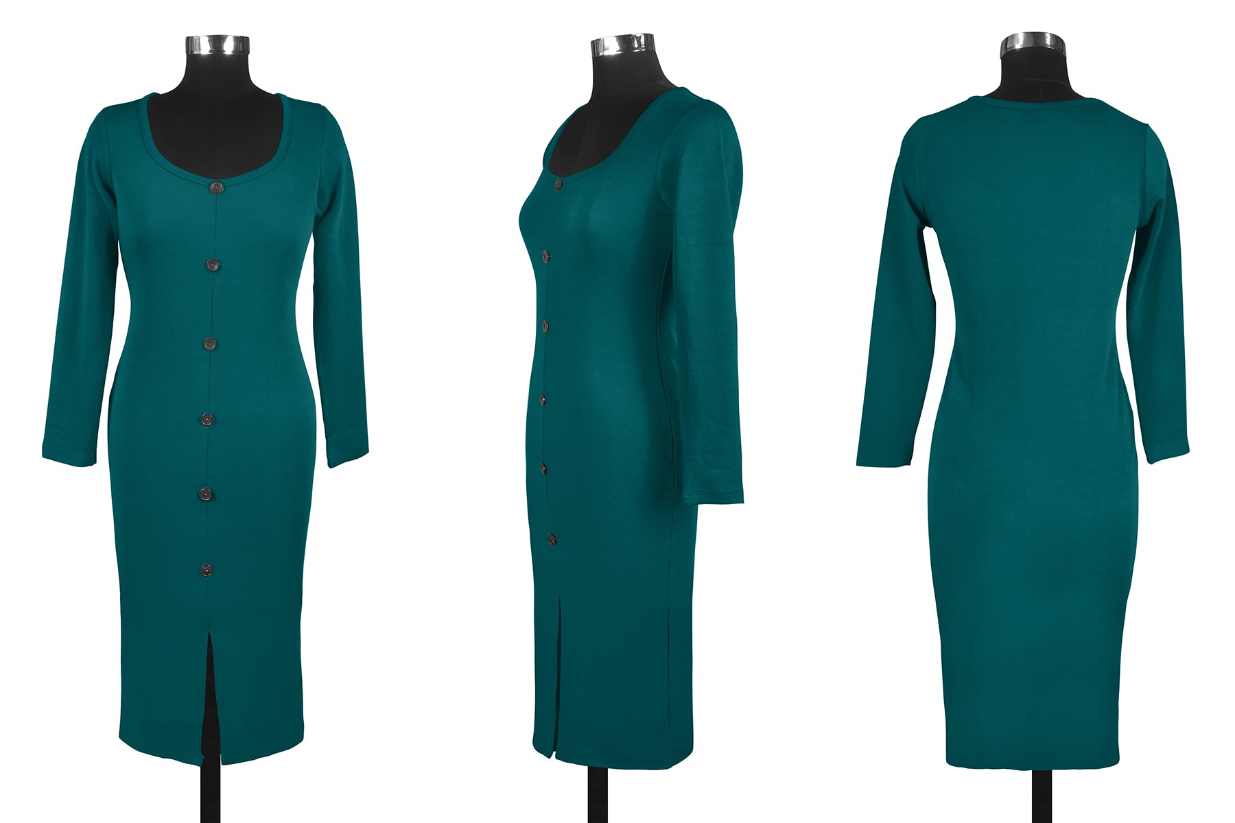 Sleek, sophisticated, and effortlessly chic—this Teal Button-Down Bodycon Midi Dress is the perfect blend of modern elegance and comfort. Featuring a flattering scoop neckline, long sleeves, and a button-down front, this dress is designed to enhance your silhouette while keeping you stylishly refined. The front slit adds a hint of allure, making it ideal for both day and evening wear. Crafted from soft, stretchable fabric, it ensures a perfect fit for any occasion.