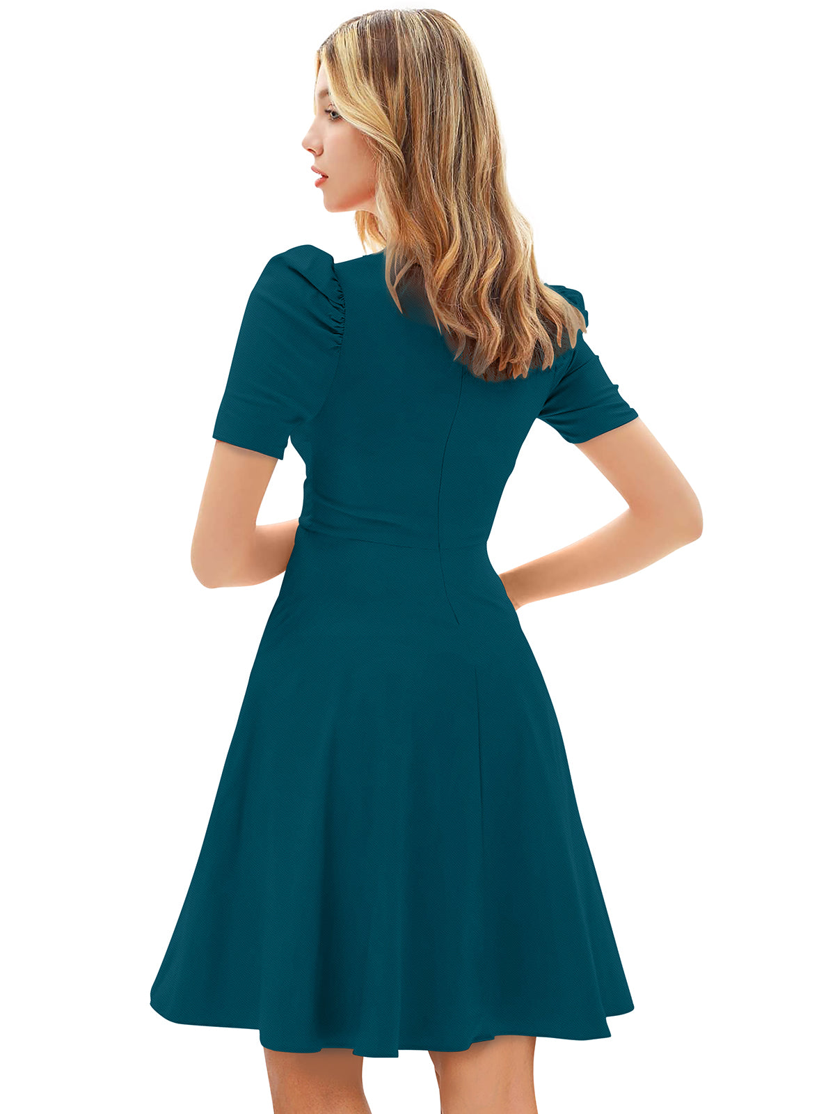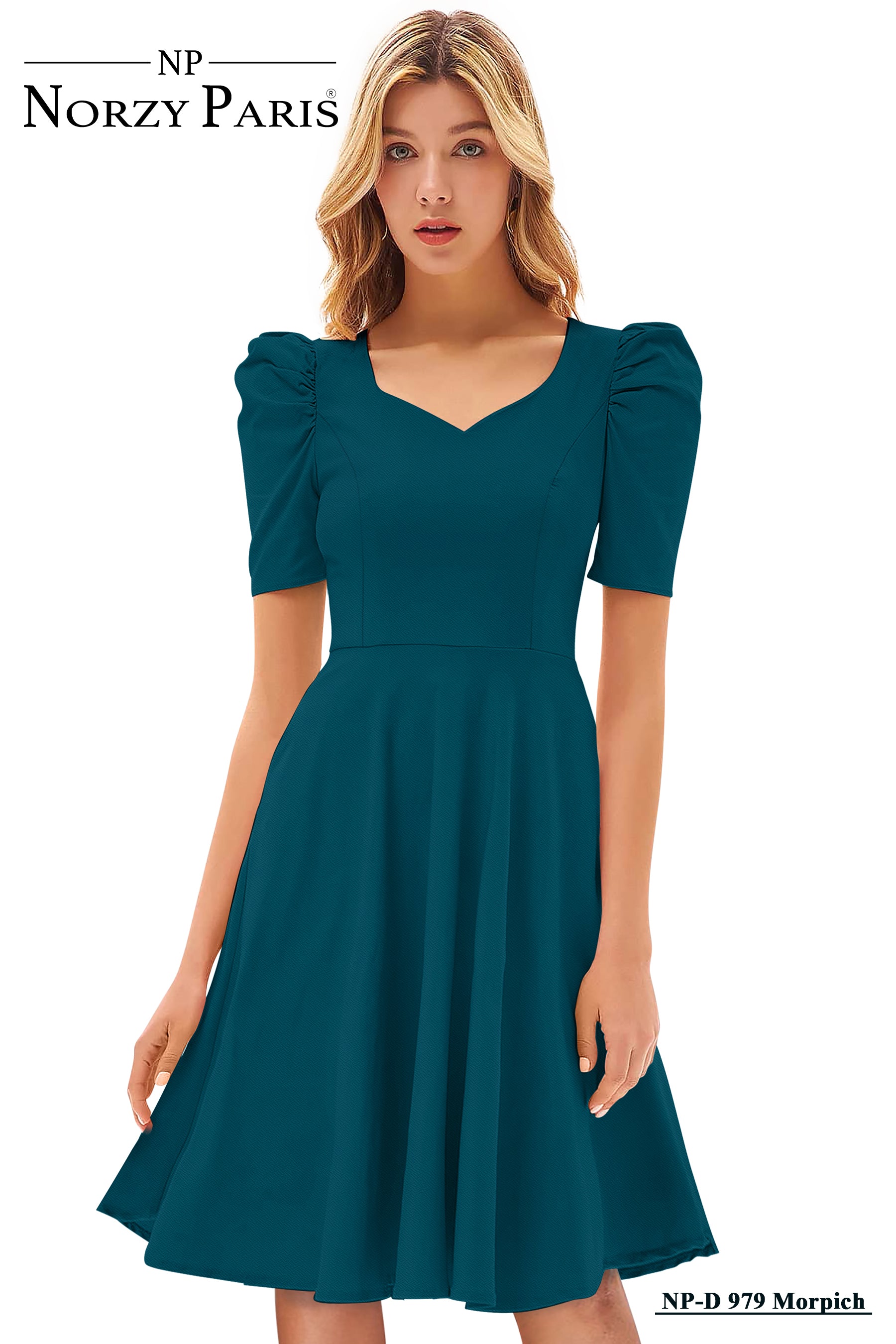 Bring timeless elegance to your wardrobe with this Teal Puff-Sleeve A-Line Dress, crafted for a chic and feminine look. The sweetheart neckline enhances your charm, while the puffed half sleeves add a touch of vintage-inspired sophistication. Designed with a fitted bodice and flared A-line hem, it creates a flattering silhouette suitable for all body types. Perfect for daytime outings, semi-formal events, or evening gatherings, this dress combines comfort with effortless style.