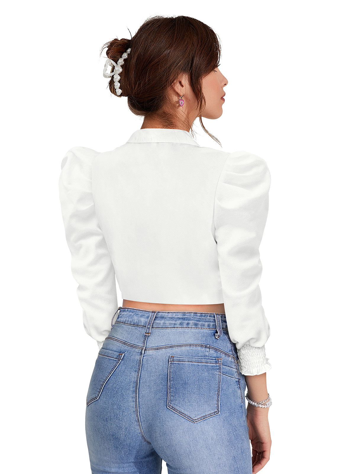 Elevate your everyday style with this fashionable black button-front cropped blouse. Designed with a tailored V-neckline and structured bodice, this top combines modern sophistication with a playful twist. The puffed long sleeves add a touch of volume and charm, while the smocked cuffs create a comfortable, secure fit. Finished with bold front buttons, this piece delivers the perfect balance of trendy and timeless.