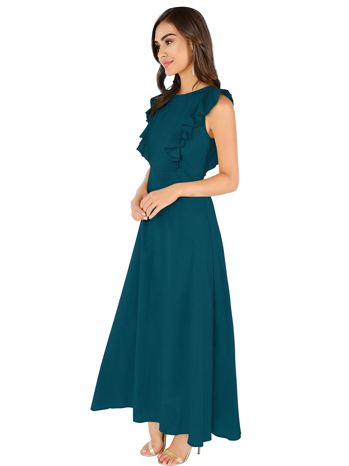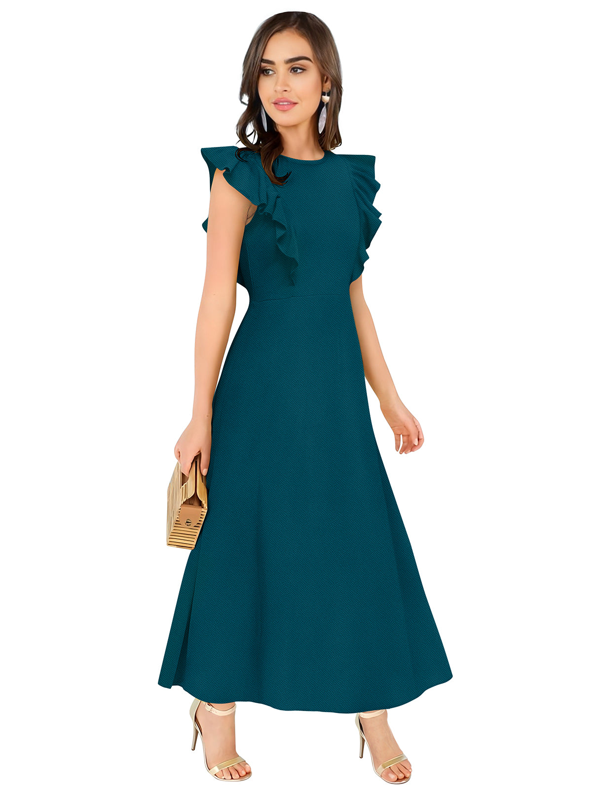 Grace every occasion with timeless charm in this Teal Ruffle-Sleeve Maxi Dress. Featuring delicate ruffled shoulder details and a flattering round neckline, this dress blends elegance with a touch of playfulness. The fitted bodice flows into a flared maxi-length skirt, creating a graceful silhouette that flatters all body types. Crafted from soft, breathable fabric, it offers all-day comfort while keeping your look effortlessly sophisticated. Perfect for brunches, garden parties, or evening gatherings, this piece is a versatile wardrobe must-have.